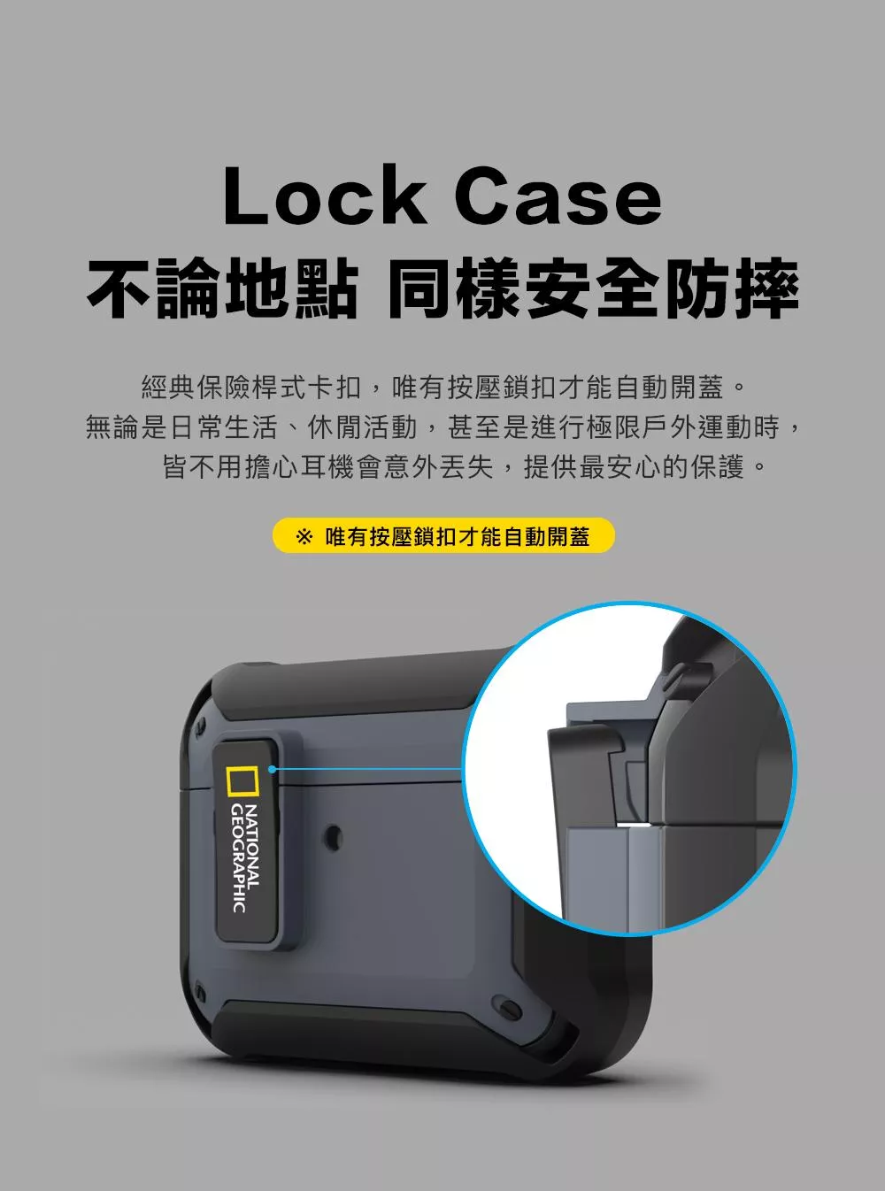 ✔️ 獨創保險桿式卡扣安心升級,唯有按壓鎖扣下方才能開蓋,不必擔心耳機丟失
